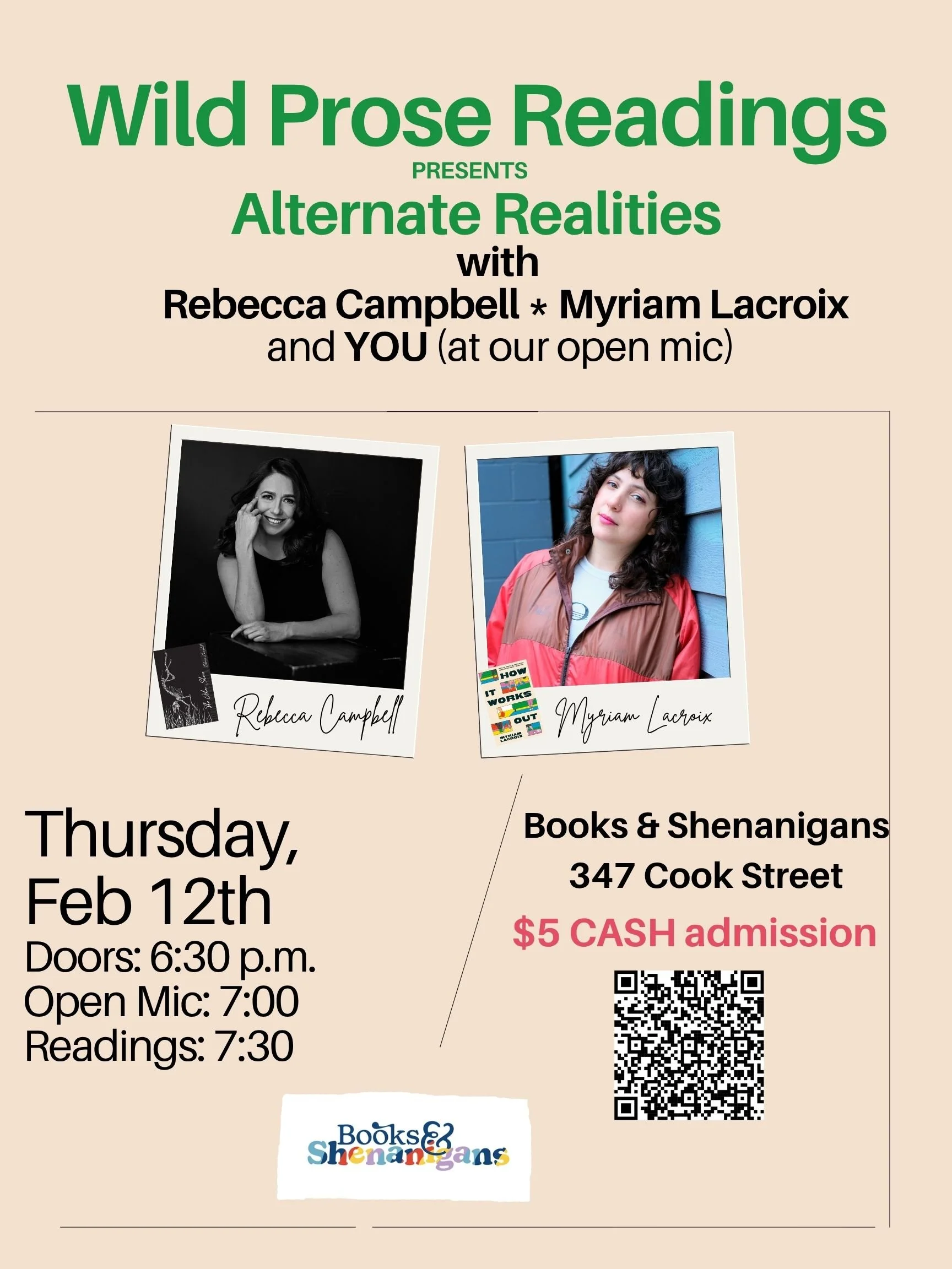 Please join us on Thursday, February 12th for Alternate Realities with Rebecca Campbell and Myriam Lacroix, reading from their fantastical books. Rebecca Campbell will read from her sci-fi/post-apocalyptic short story collection, The Other Shore, and Myriam Lacroix will read from her story collection about the many absurdist iterations of one couple, How It Works Out. We’ll finish with a Q&A with the authors.